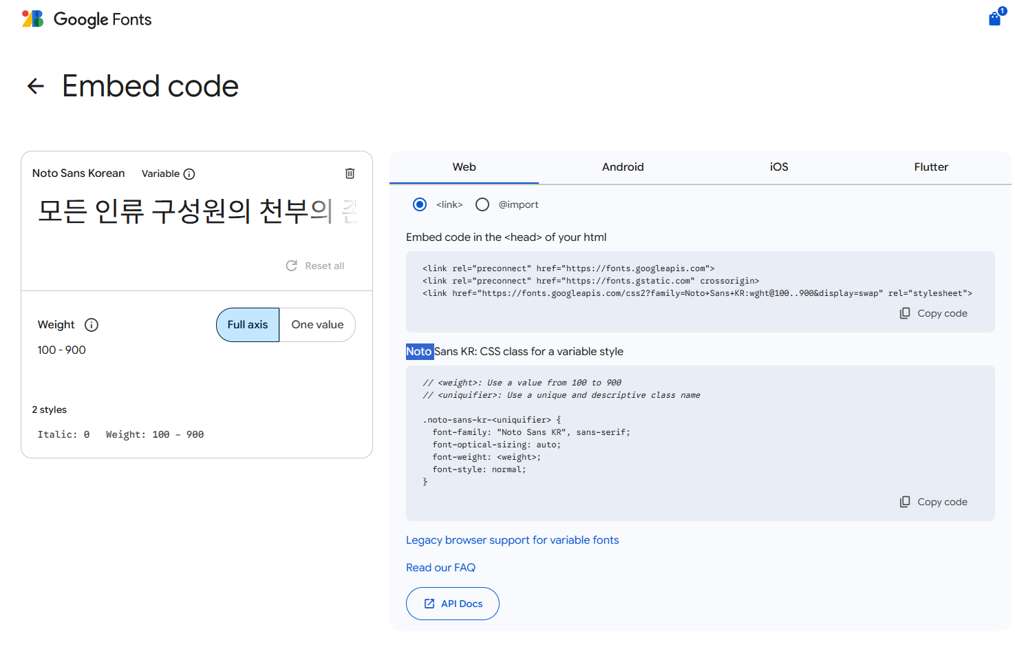 예를 들어 Noto Sans KR은 100 ~ 900까지 다양한 두께를 제공합니다.